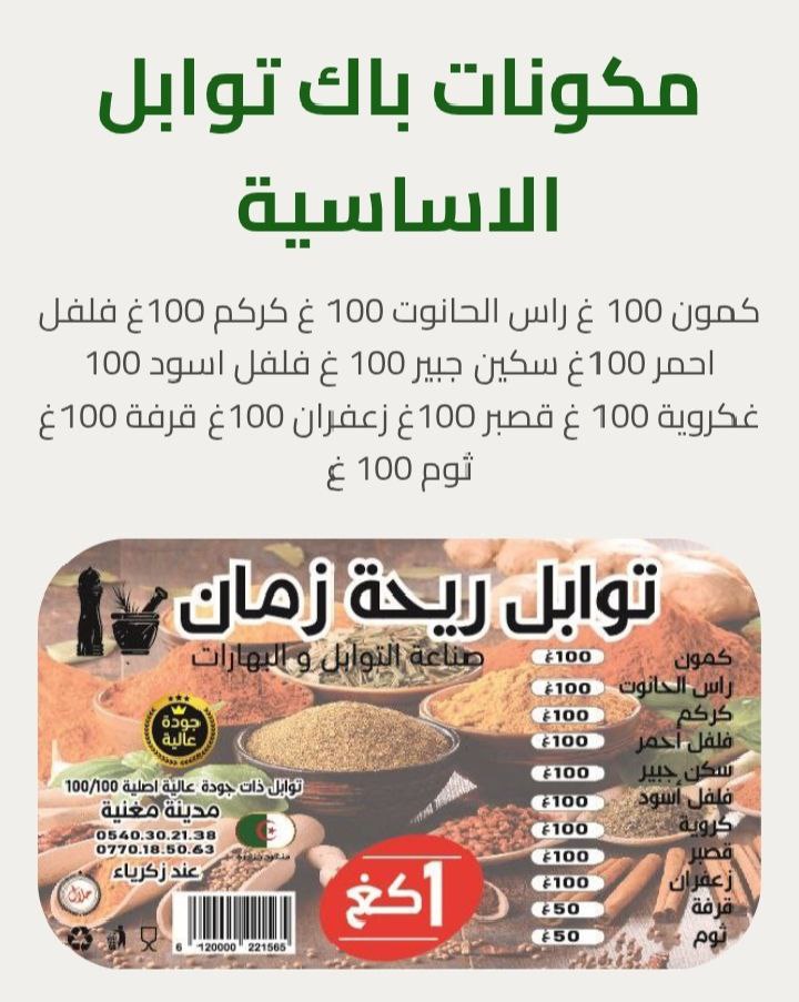 ✨ توابل ريحة زمان ✨ نكهة أصيلة من قلب المطبخ الجزائري... خلطات طبيعية 100% برائحة تعيدك لأيام زمان، ولذّة تخلّي كل طبق يحكي حكاية! 🌿🍲 ريحة زمان... الطيب يبان من ريحتو.